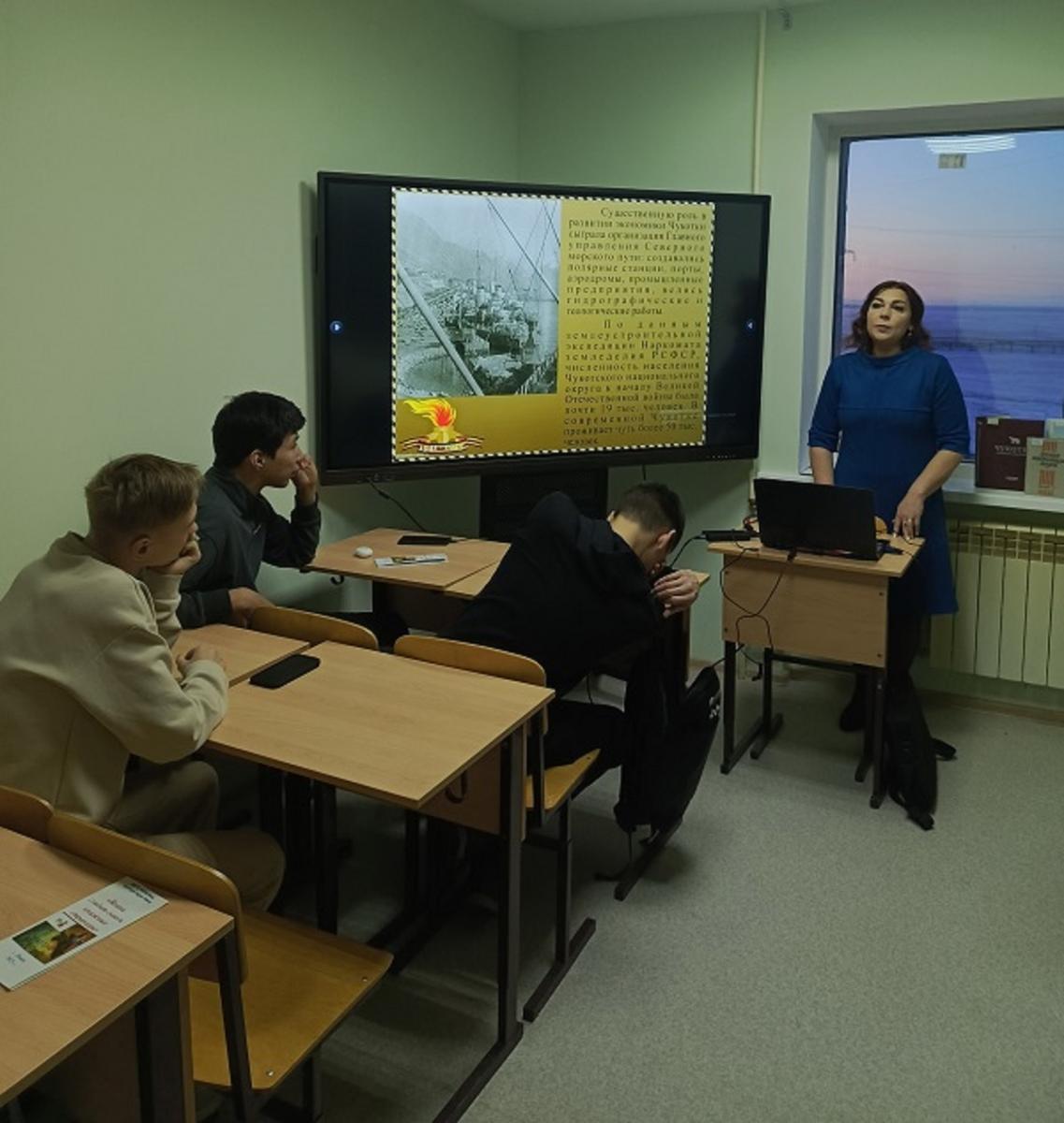 Главный библиотекарь отдела массово-информационной работы и некоммерческих услуг Анна Гусарова провела для студентов «Чукотского северо-западного техникума г. Билибино» структурного подразделения г. Певек командную литературную игру «Нам годы эти не забыть».
