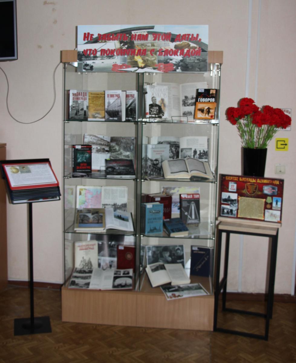В книгах, представленных на экспозиции, рассказывается о беспримерном подвиге осаждённого фашистами Ленинграда, о мужестве и героизме его жителей, сумевших выстоять в нечеловеческих условиях блокады, переживших страшный голод, страдания, смерть близких. В книгах можно найти информацию о прорыве кольца, о героической битве за Ленинград, об участниках сражений.