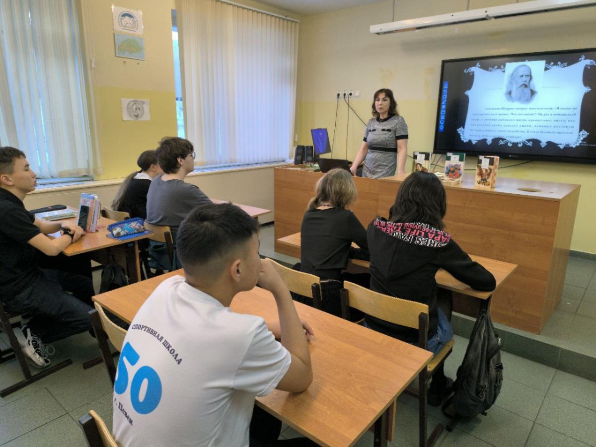 Главный библиотекарь отдела массово-информационной работы и некоммерческих услуг Анна Гусарова, используя мультимедийную презентацию, рассказала девятиклассникам о фактах биографии и творчества Михаила Евграфовича, выдающегося русского писателя-реалиста, сатирика, литературного критика. Подчеркнув, что творчество М. Е. Салтыкова-Щедрина чрезвычайно многообразно.