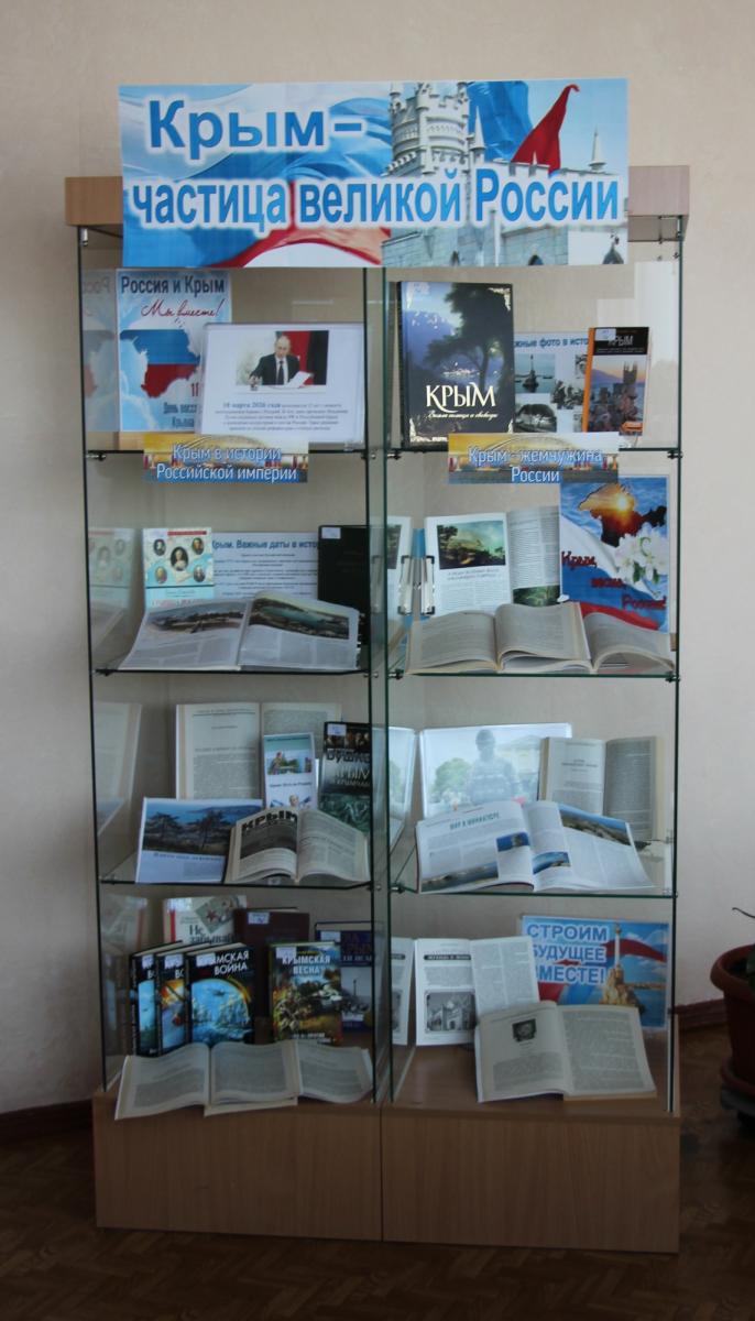 Этому событию посвящена книжно-иллюстративная выставка «Крым – частица великой России» (16+) в Отделе массово-информационной работы и некоммерческих услуг, с двумя разделами, освещающими важные вехи в летописи полуострова.