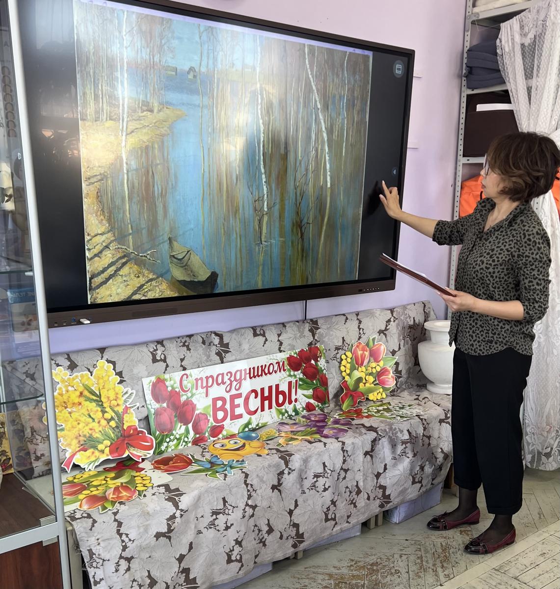 Поэты используют слова, композиторы – звуки, а художники… Что используют художники? Краски, кисти, холст. Сотрудник библиотеки показала картины: Иссака Левитана, Алексея Саврасова, Игоря Грабаря и Константина Иона, а ребята рассказывали, какое настроение создают эти картины и какие цвета используют художники для весны.